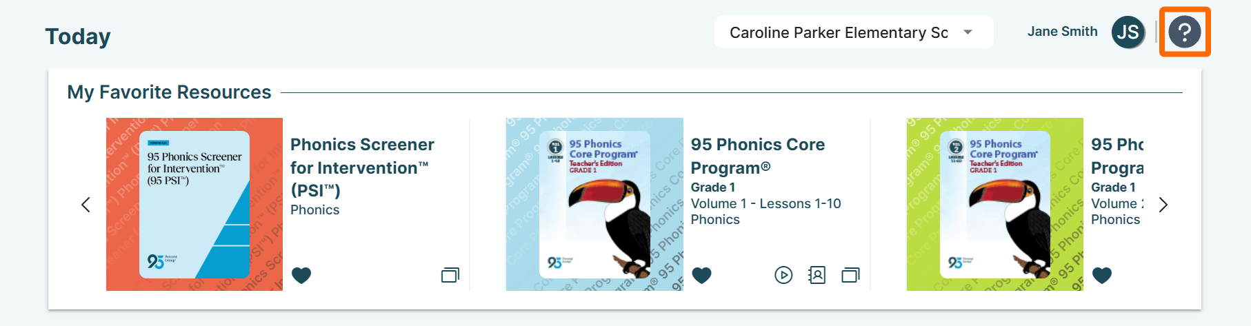 All resources licensed to you by your district can be accessed from the Resources page and returned to the Today page by clicking the empty Favorites heart icons.