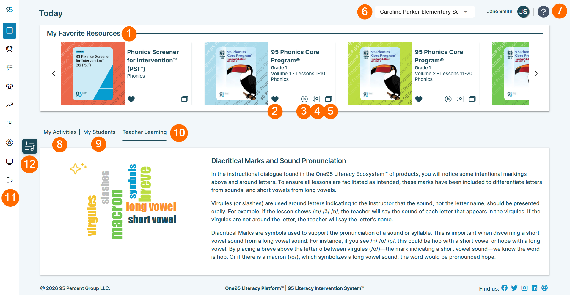 The My Favorite Resources section displays a scrolling carousel of favorited, frequently used early literacy resources from 95 Percent Group. These are resources you would like readily accessible upon login.
