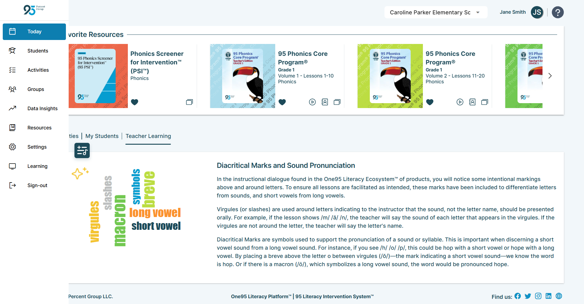 The Teacher Learning section or tab highlights tips and notices of interest related to 95 Percent Group, the One95 platform, and the science of reading.