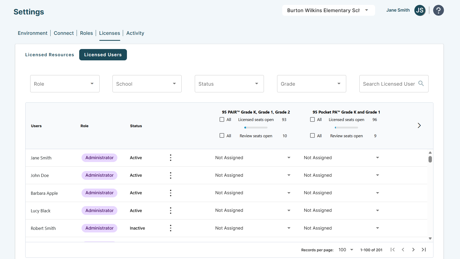 Select User Licenses from the drop-down to download a CSV file of your district's active license assignments.