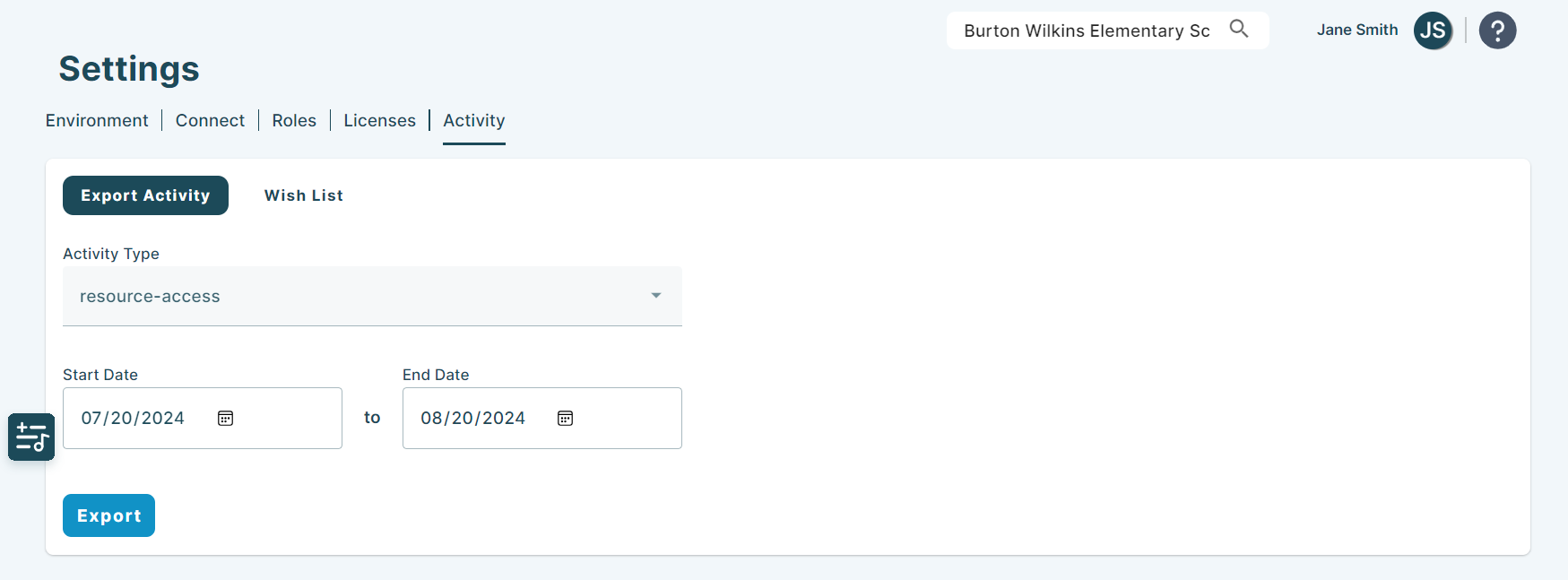 Selecting a date range is ineligible for this activity type, as the export captures the licenses currently assigned to users in your district.
