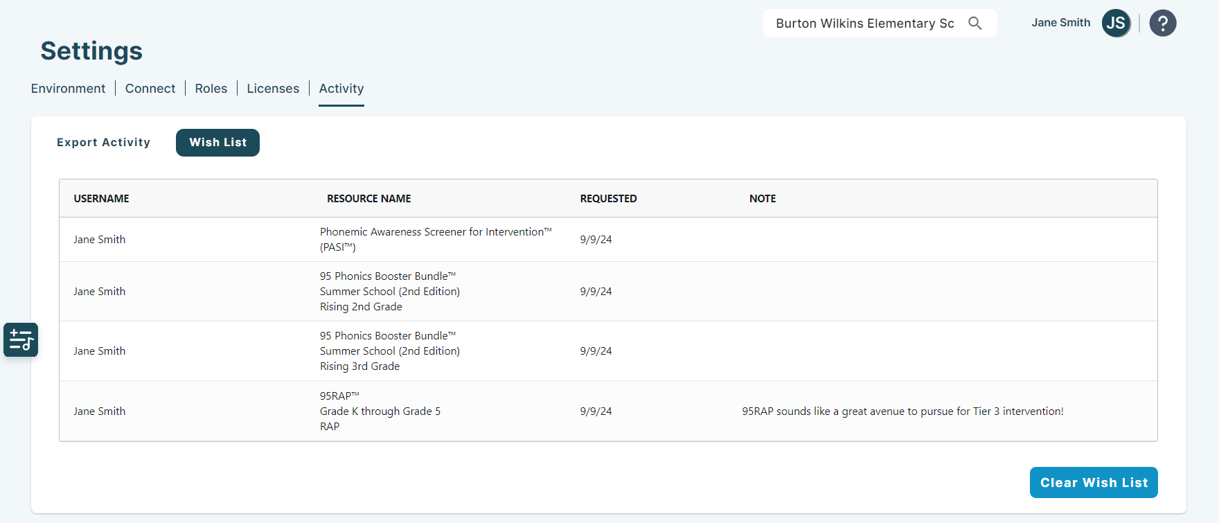 Note that the queue will be immediately reset after clicking this button. Clearing the wish list clears it for every One95 Administrator in your district and cannot be undone.