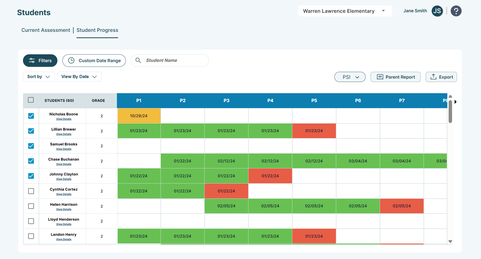 The latest assessment results and administration dates for each assessed skill are displayed. Each row includes students’ names, ID, grade, and color-coded summaries of proficiency percentages.