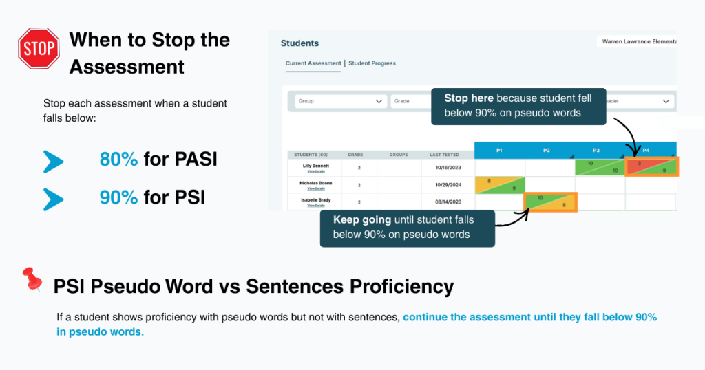 - Then, use the Grade Level & Time of Year Guidance Chart and the When to Stop Assessments Chart to ensure assessors started with the correct assessment and skill and stopped when students fell below proficiency for each grade level.