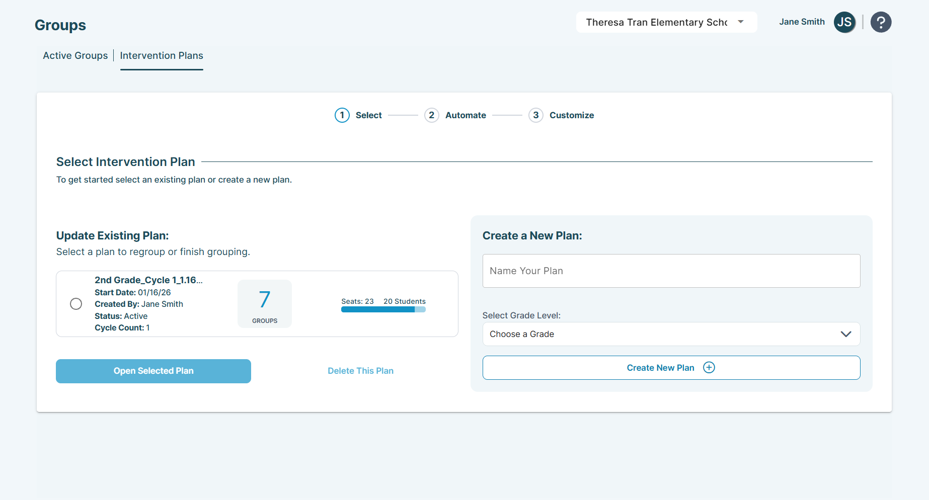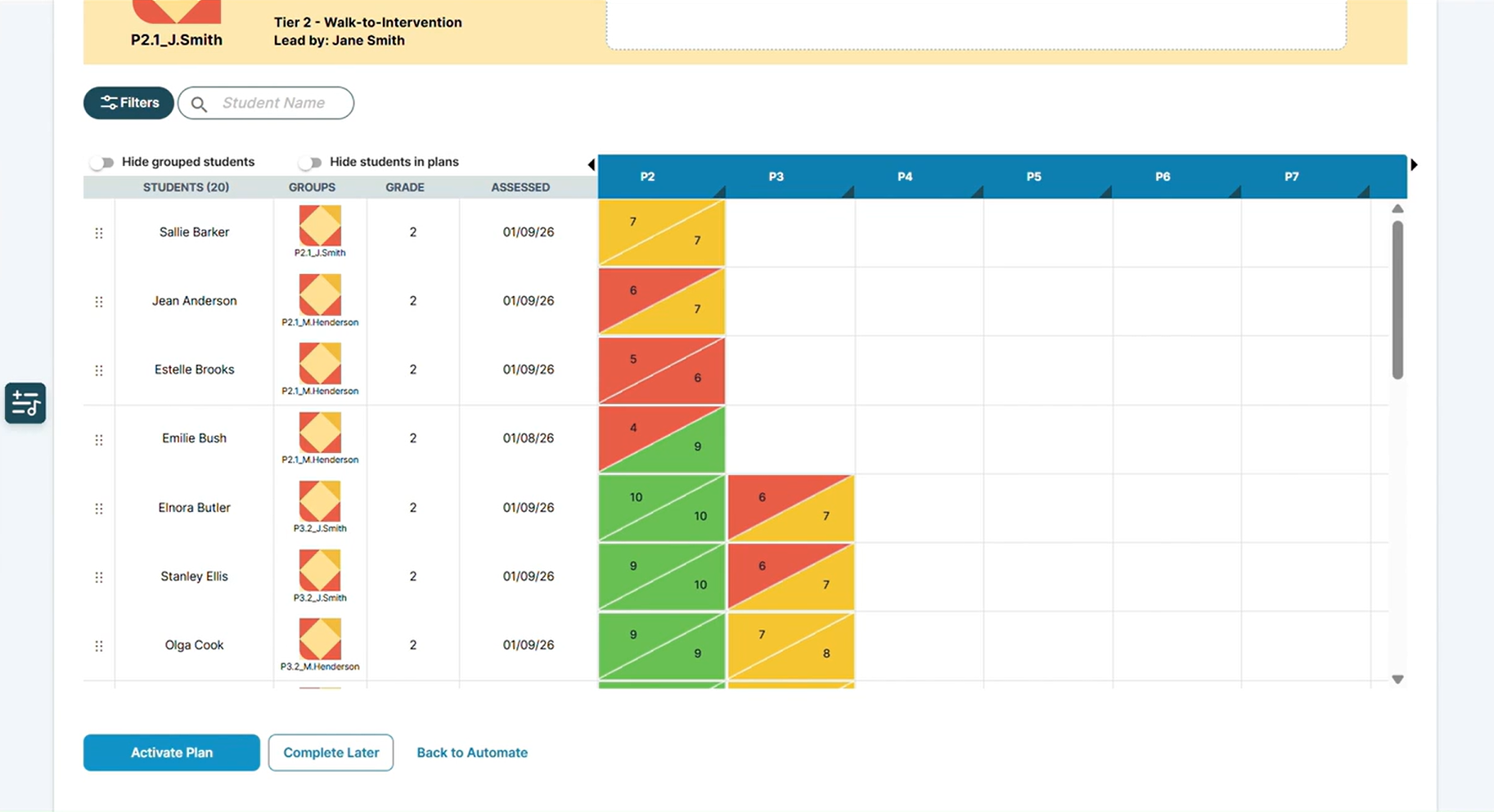 You can structure these plans by grade level, across multiple grades, by group leader, instruction time, or any strategy that fits your school's grouping approach—creating one intervention plan at a time.