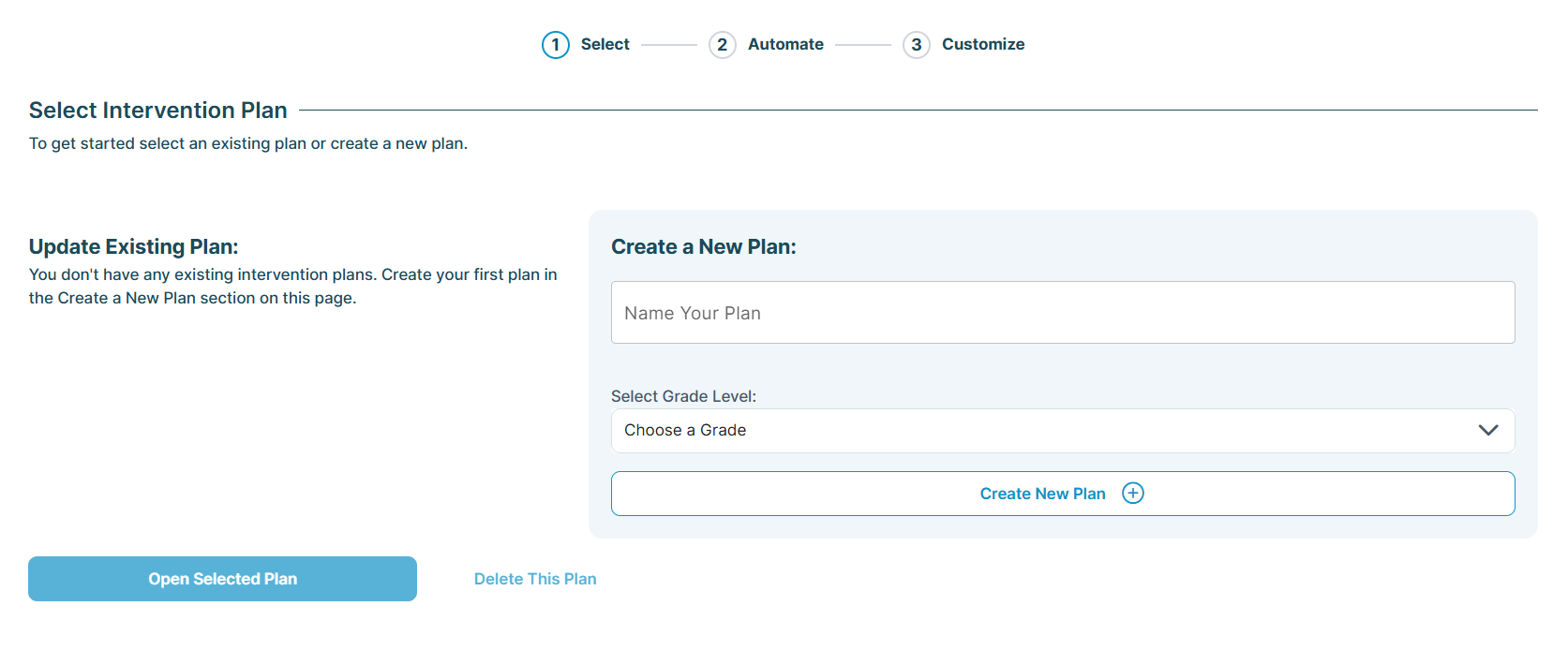 Creating your intervention plans involves a three-step process: Select, Automate, and Customize.