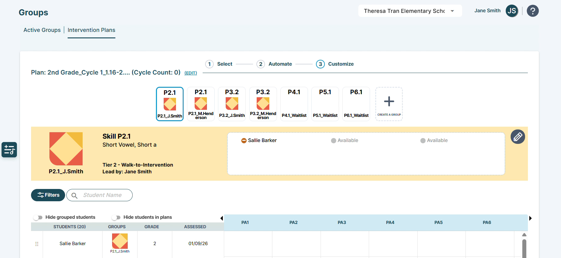 The 95 LIS allows you to create multiple intervention plans to organize your active groups from cycle to cycle, using students' most recent PASI or PSI assessment data displayed on the power grid.